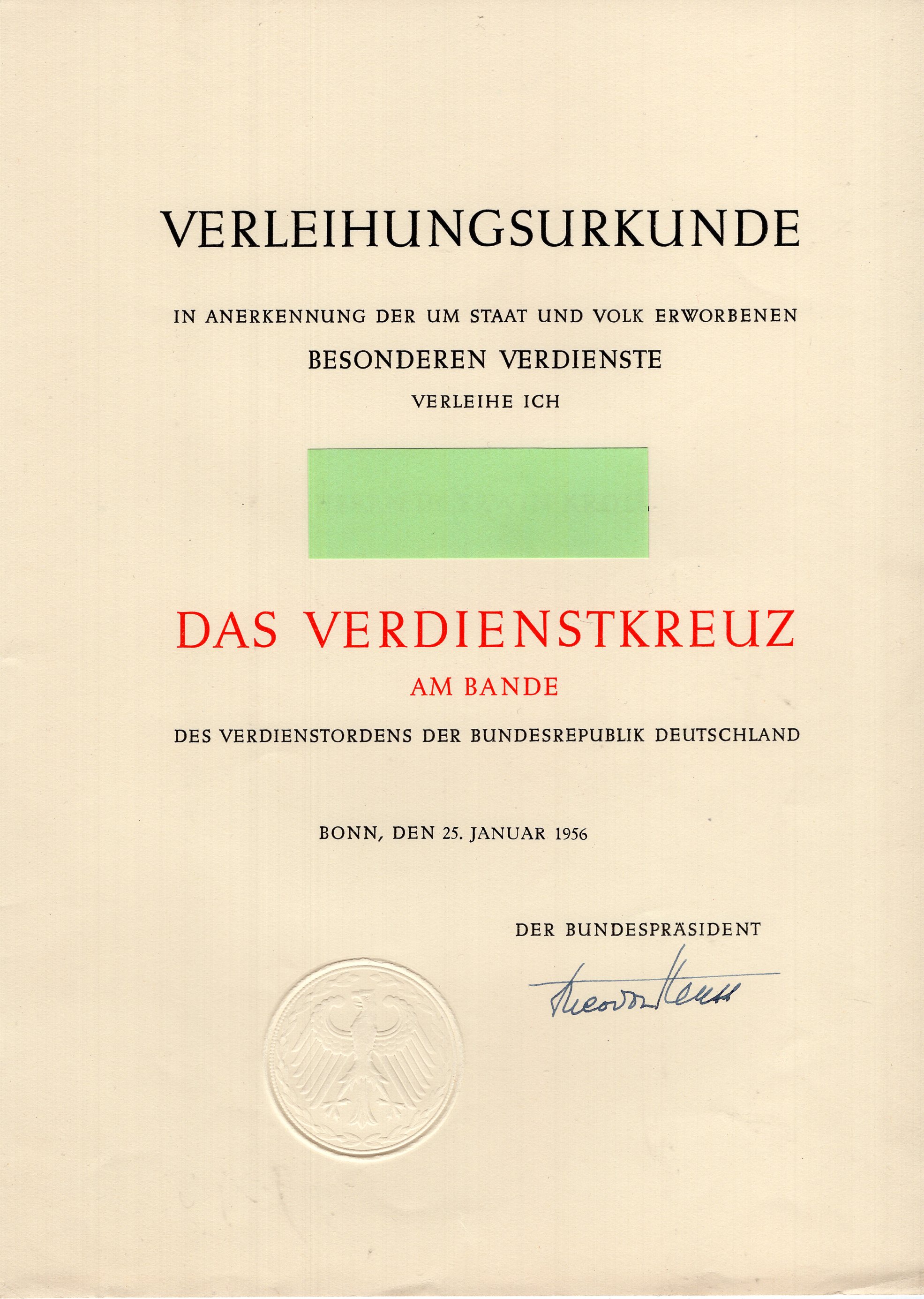 Heuss (†), Theodor - sign. Urkunde + Verdienstkreuz am Bande