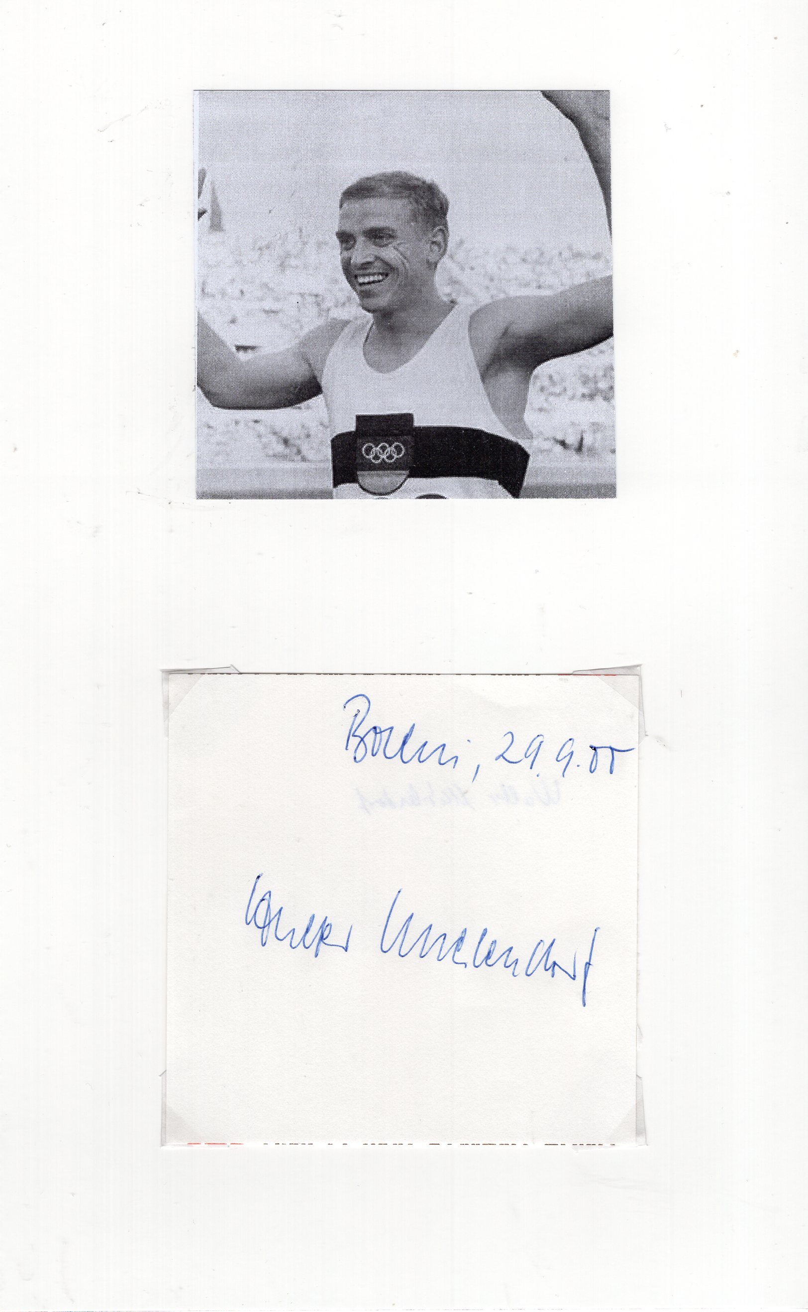 signierte Blankokarte 10x10cm. Die Karte ist zusammen mit einem Bild auf einem Karton 17x28cm mit Fotoecken befestigt.